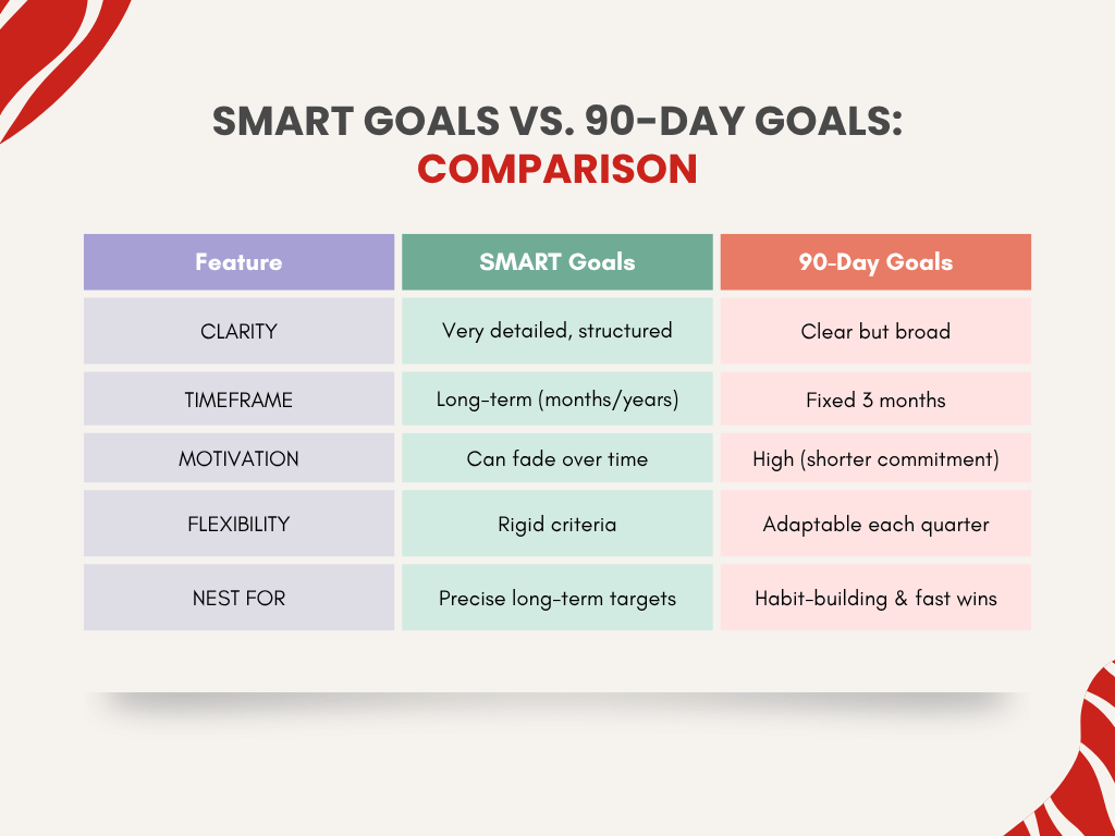 The truth is, you don’t have to pick one. The most effective approach is to combine SMART goals with a 90-day timeframe.